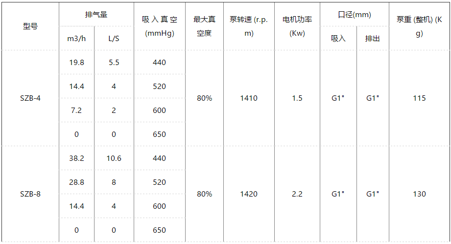 目前制造的本型號泵有:SZB—4、SZB-8。其中4(8)表示當水銀柱高為520毫米時的氣量(升/秒)。產品詳細介紹: